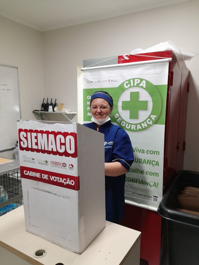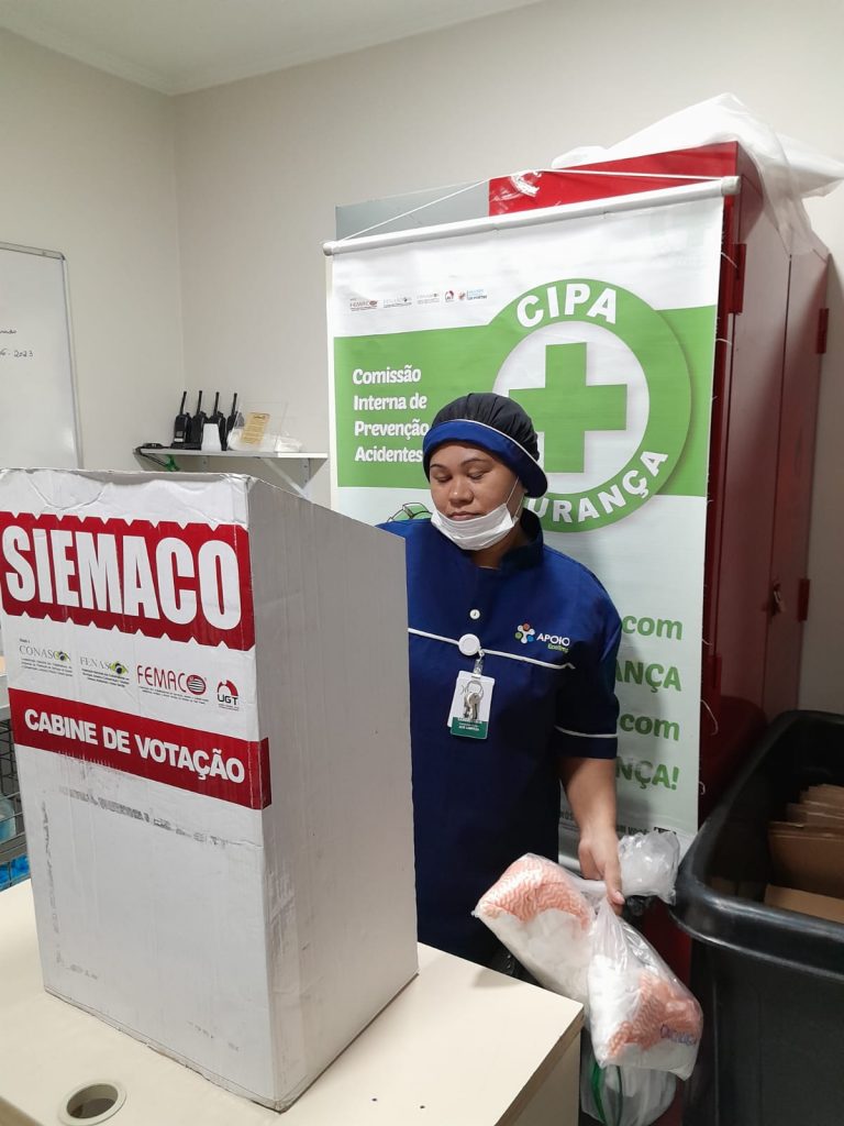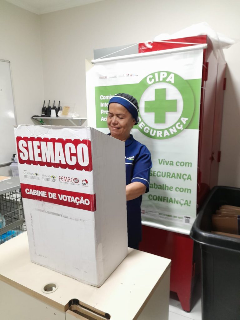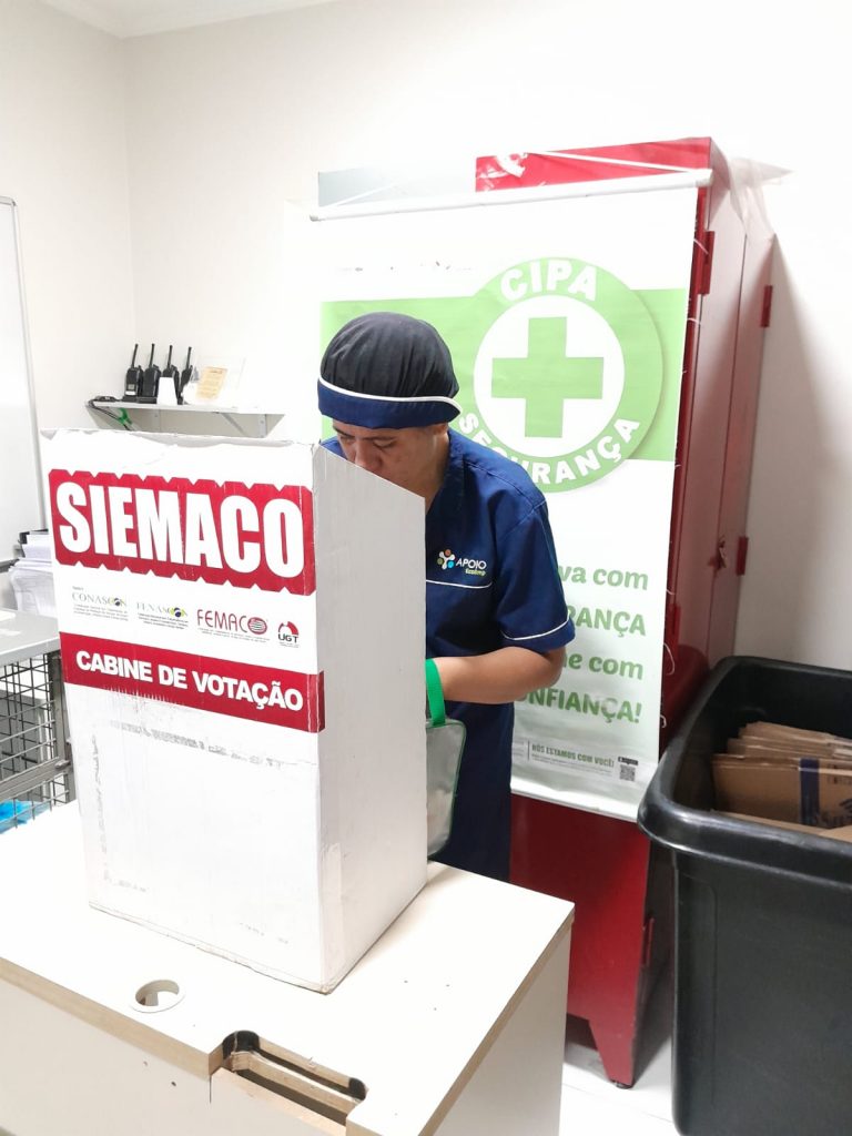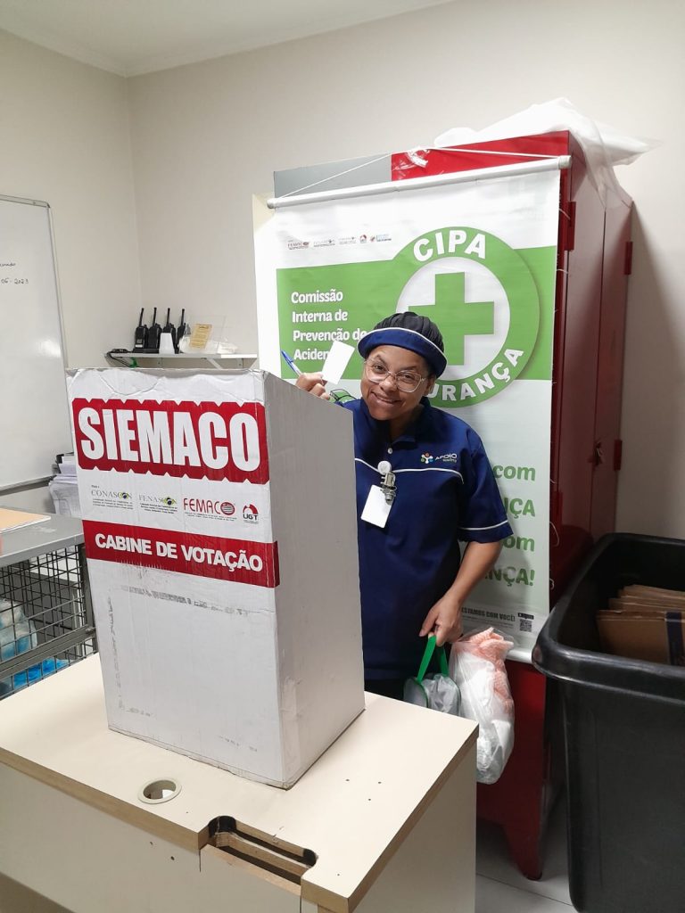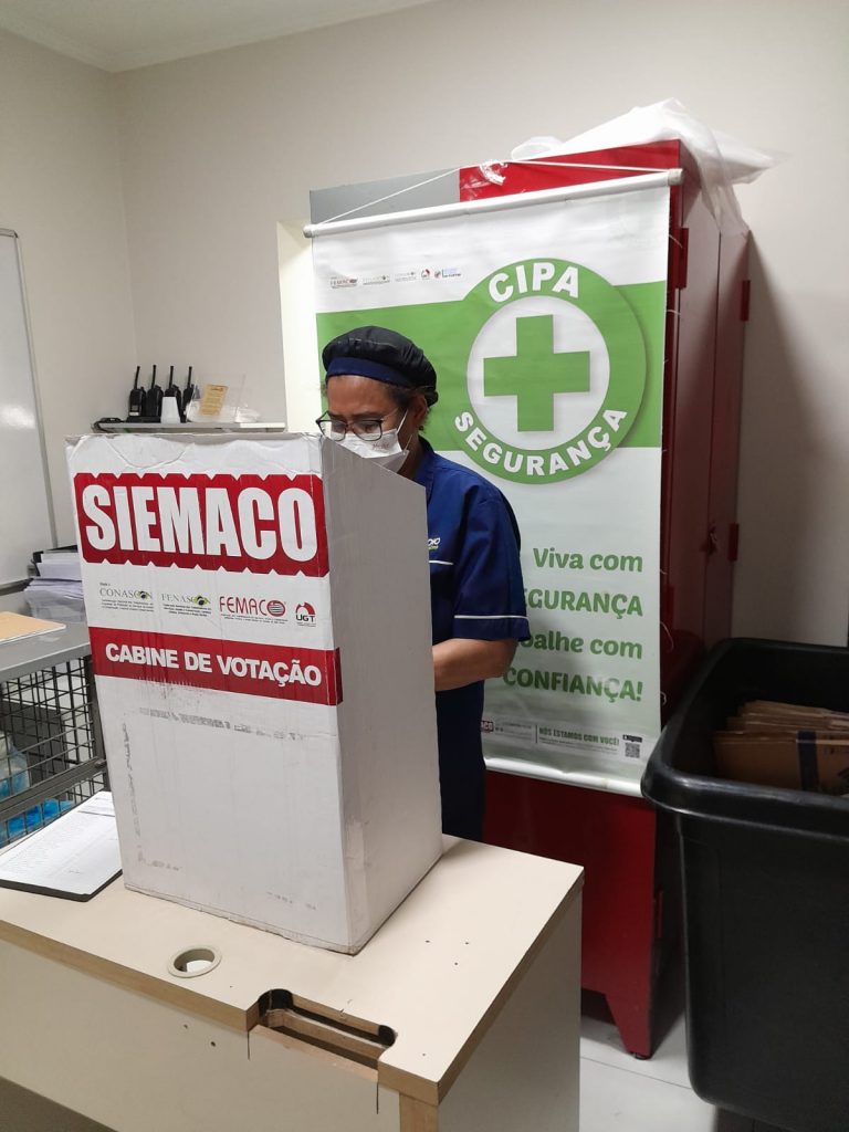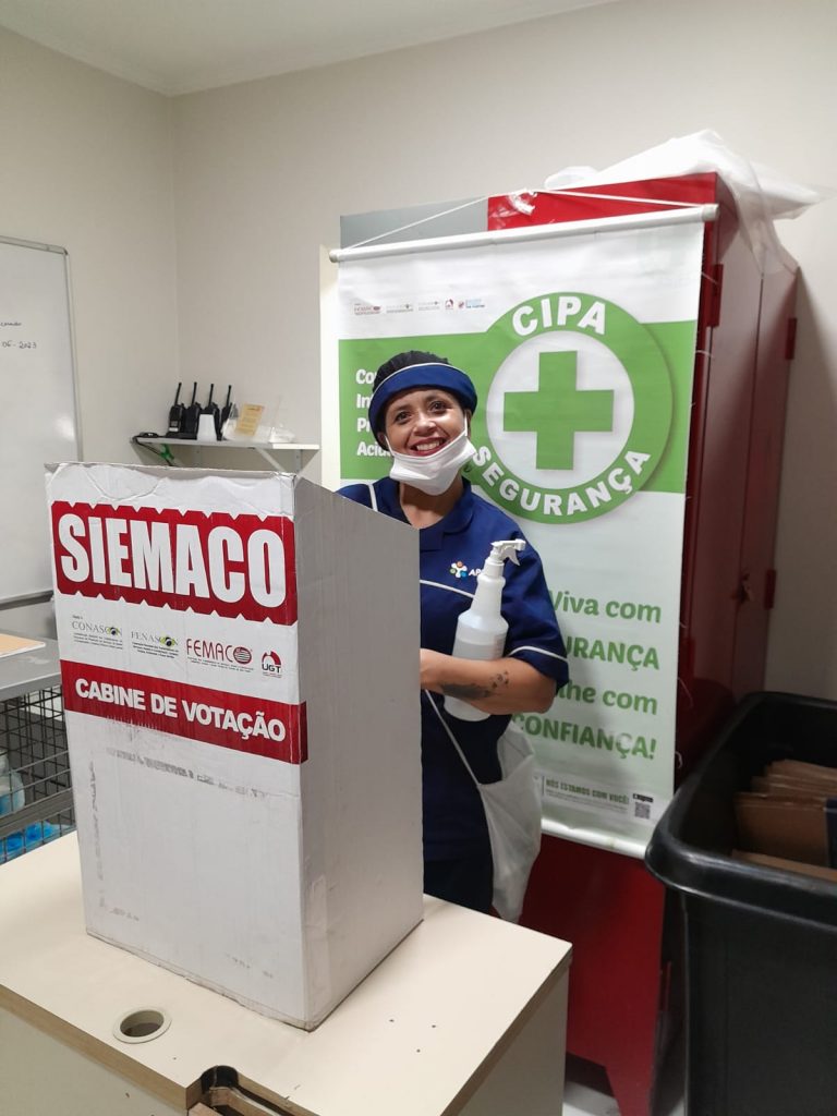 No dia 30 de outubro, os Assessores de Base do Siemaco Guarulhos Renato e Elaine, realizaram uma eleição de CIPA (Comissão Interna de Prevenção de Acidentes e de Assédio) na empresa Apoio Ecolimp, responsável pela limpeza do Hospital Carlos Chagas.