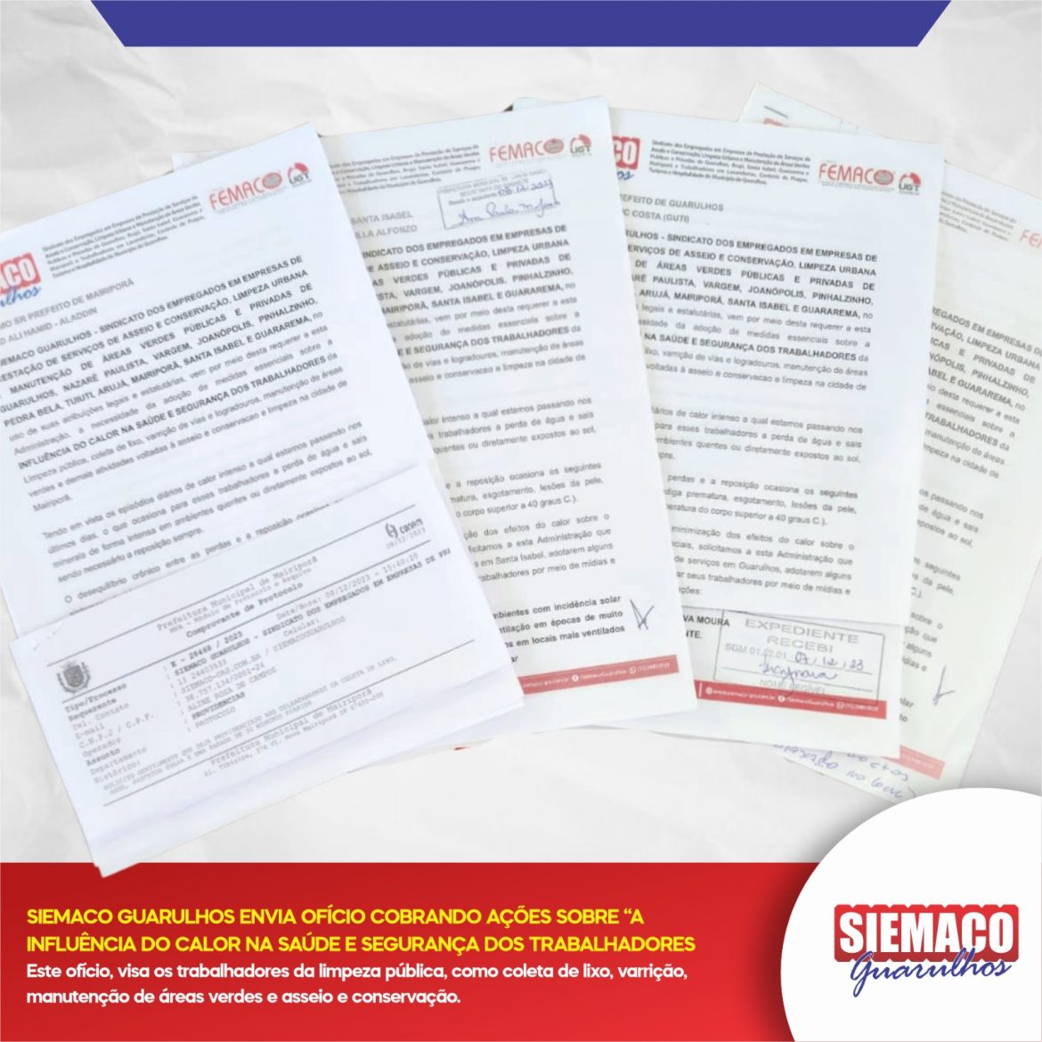 Pensando na saúde, e segurança dos nossos trabalhadores, o Siemaco Guarulhos enviou ofícios sobre a Influência do Calor na Saúde e Segurança dos trabalhadores, das cidades de Mairiporã, Santa Isabel, Guarulhos e Guararema. Este ofício, visa os trabalhadores da limpeza pública, como coleta de lixo, varrição, manutenção de áreas verdes e asseio e conservação.