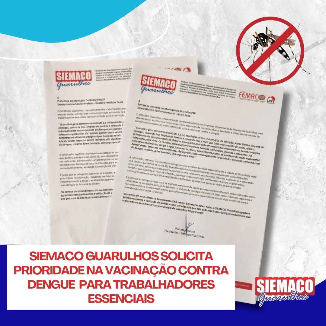 Por isso, estamos pedindo ao Prefeito da cidade de Guarulhos, Gustavo Henrique Costa, e ao Secretário Adam Kubo que priorizem a vacinação aos nossos trabalhadores da limpeza, zeladoria e aos coletores contra a Dengue. Além de proteger a saúde deles, isso também contribuirá para reduzir os riscos de contágio da dengue e manter nossa comunidade mais segura. Vamos unir forças e fazer a diferença!