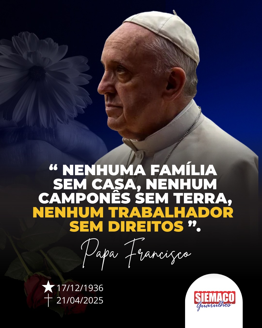 A direção do Siemaco Guarulhos lamenta profundamente a perda de um dos maiores líderes religiosos e defensores dos direitos dos trabalhadores do nosso tempo: o Papa Francisco. Em um momento histórico marcado por ataques ao movimento sindical vindos, inclusive, de setores religiosos, sua trajetória se destaca como um farol de coerência, coragem e compromisso com a justiça social.